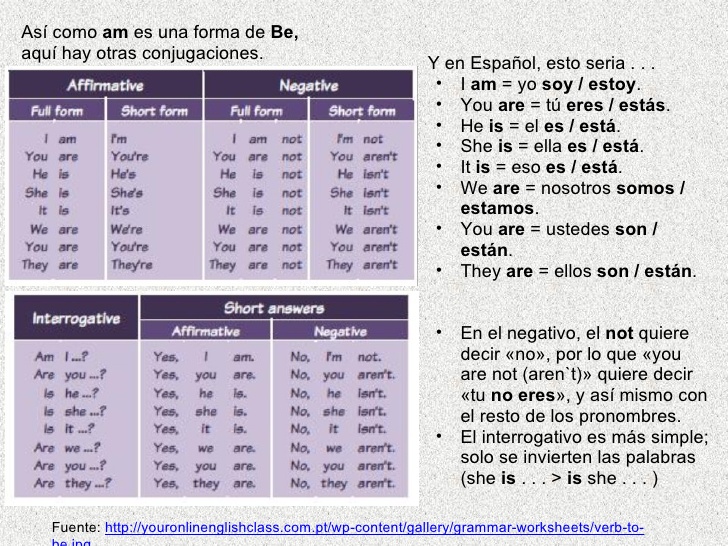 El verbo ‘To be’ tiene una importancia especial en inglés. Se corresponde a los verbos españoles « ser » y « estar ». Dependiendo del sentido de la frase deduciremos de cual de los dos se trata.